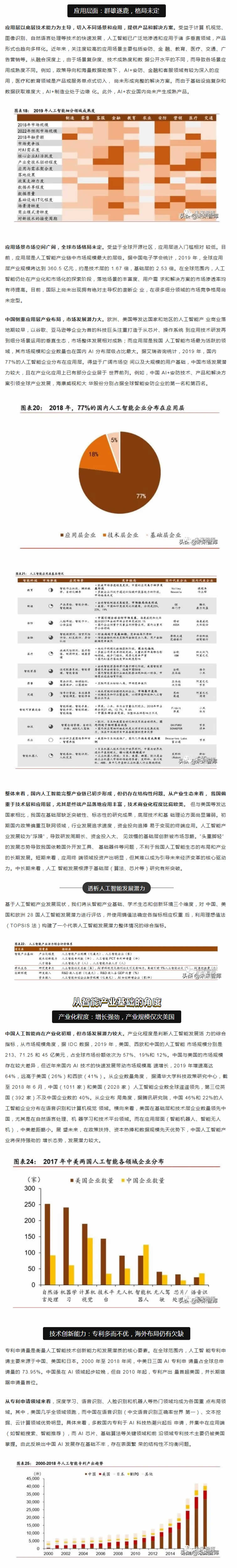 從中短期看,技術(shù)優(yōu)化、落地場景的開拓和滲透是是主要的增長點;從長期看,智能生 態(tài)體系建設(shè)才是彎道超車的必由之路。人工智能產(chǎn)業(yè)的核心競爭力在于生態(tài)體系的建設(shè), 包括大數(shù)據(jù)、算法理論、底層技術(shù)、應(yīng)用生態(tài)、人才儲備等層面。而我國人工智能產(chǎn)業(yè)生 態(tài)和基礎(chǔ)設(shè)施建設(shè)正處于探索期,如何實現(xiàn)核心技術(shù)的突破和拓寬人工智能技術(shù)與社會經(jīng) 濟融合場景著力點在于人才儲備和持續(xù)的研發(fā)投入。從人才的角度,收窄技術(shù)差距的根本 在于優(yōu)化人的知識結(jié)構(gòu)和能力。當(dāng)前政策應(yīng)側(cè)重建立人才培養(yǎng)體系,為人工智能打造人才 資源池,尤其是在基礎(chǔ)學(xué)科L域突破人才瓶頸。同時,打破“唯數(shù)量論”的科研評價和考 核體系,改變?nèi)瞬偶顧C制勢在必行。我國人工智能專利申請和科研產(chǎn)出數(shù)量L先, 但質(zhì)量堪憂。唯有從源頭改變評價機制,才能扭轉(zhuǎn)“量多而質(zhì)優(yōu)”的問題。從研發(fā)的角度, 企業(yè)技術(shù)優(yōu)化和創(chuàng)新能力是解決產(chǎn)業(yè)痛點的關(guān)鍵;A(chǔ)研究的投入周期長、不確定性大、 和風(fēng)險G特點決定了其難以短期內(nèi)獲得投資回報,但基礎(chǔ)L域的突破將為經(jīng)濟帶來長期和 廣泛的溢出效應(yīng),因此,國內(nèi)更應(yīng)關(guān)注底層技術(shù)的研發(fā)投入,扭轉(zhuǎn)傳統(tǒng)技術(shù)路徑,顛覆核 心技術(shù)受制于人的被動局面。此外,人工智能在賦能機器模擬人類進行決策的同時產(chǎn)生的 倫理道德、隱私保護和社會安全問題值得關(guān)注。由于法律法規(guī)存在滯后性,尚無法對人工 智能技術(shù)進行有效監(jiān)管。我國應(yīng)加快人工智能倫理研究,及早識別人工智能治理風(fēng)險。