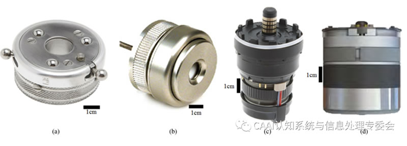 主動(dòng)單自由度腕部通常在假肢和機(jī)器人應(yīng)用中都能找到。在假肢L域,這些系統(tǒng)通常與EMG系統(tǒng)一起使用,使用戶能夠通過(guò)肌肉信號(hào)控制旋轉(zhuǎn);顒(dòng)手腕可以是獨(dú)立的單元集成到假手中,或者集成到較大假手中的前臂中。與被動(dòng)手腕類似,主動(dòng)單自由度裝置也可分為旋轉(zhuǎn)器和屈肌。主動(dòng)旋轉(zhuǎn)器是腕部假體中常見的動(dòng)力裝置。獨(dú)立設(shè)備包括運(yùn)動(dòng)控制電動(dòng)旋轉(zhuǎn)器和OB腕部旋轉(zhuǎn)器,如圖(c)所示,這兩種設(shè)備都是為與許多終端設(shè)備兼容而設(shè)計(jì)的,因而得到了相對(duì)廣泛的應(yīng)用。OB-Michelangelo手和TBi-Limb Quantum都使用緊湊的旋轉(zhuǎn)器,即軸旋轉(zhuǎn)和俯臥旋轉(zhuǎn)[圖(d)],它們分別安裝在各自手的假體窩和下手掌中,主動(dòng)屈肌也往往納入現(xiàn)有的機(jī)器人手或終端設(shè)備系統(tǒng)。