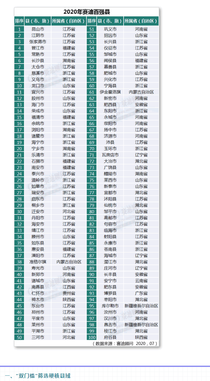 2020年7月28日,由賽迪顧問(wèn)縣域經(jīng)濟(jì)研究中心編制的《2020中國(guó)縣域經(jīng)濟(jì)百?gòu)?qiáng)研究》正式發(fā)布。該研究聚焦新時(shí)代縣域G質(zhì)量發(fā)展的新動(dòng)力、新機(jī)制,多面解讀了縣域百?gòu)?qiáng)的區(qū)域格局和發(fā)展特征。