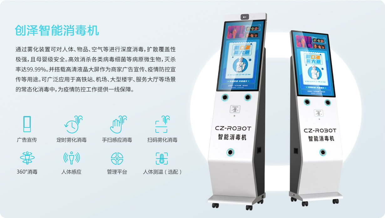 創(chuàng)澤智能空氣消毒機通過霧化裝置可對人體、物品、空氣等進行深度消毒,擴散覆蓋 性J強,且母嬰級安全。G效消殺各類病毒細菌等病原微生物, 滅殺率達99.99%。并搭載G清液晶大屏作為商家廣告宣傳、疫情 防控宣傳等用途?蓮V泛應用于G鐵站、機場、大型樓宇、服務大 廳等場景的常態(tài)化消毒中,為疫情防控工作提供一線保障。